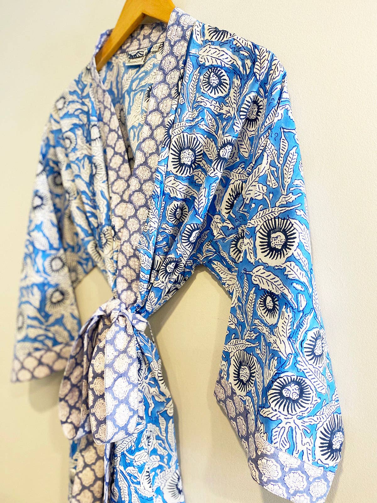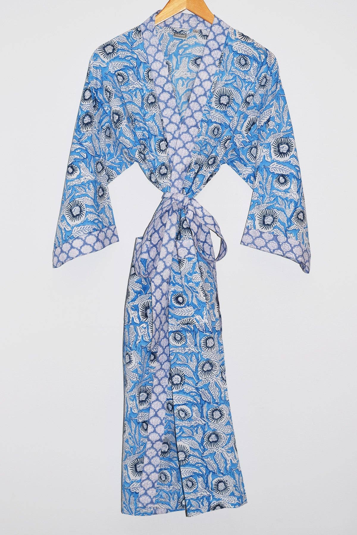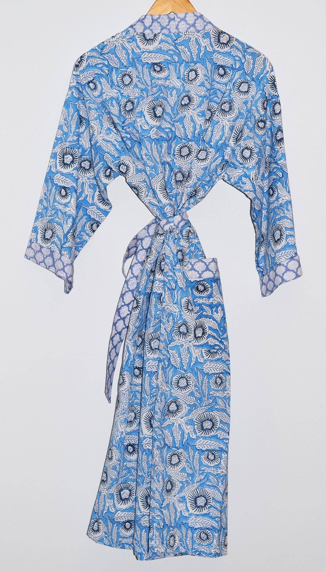Long cotton kimono robe with stitched placket detail and pockets. Matching belt, interior ties and hanging loop at inside back neck. Designed in Boston, MA, hand block printed in Jaipur, India.