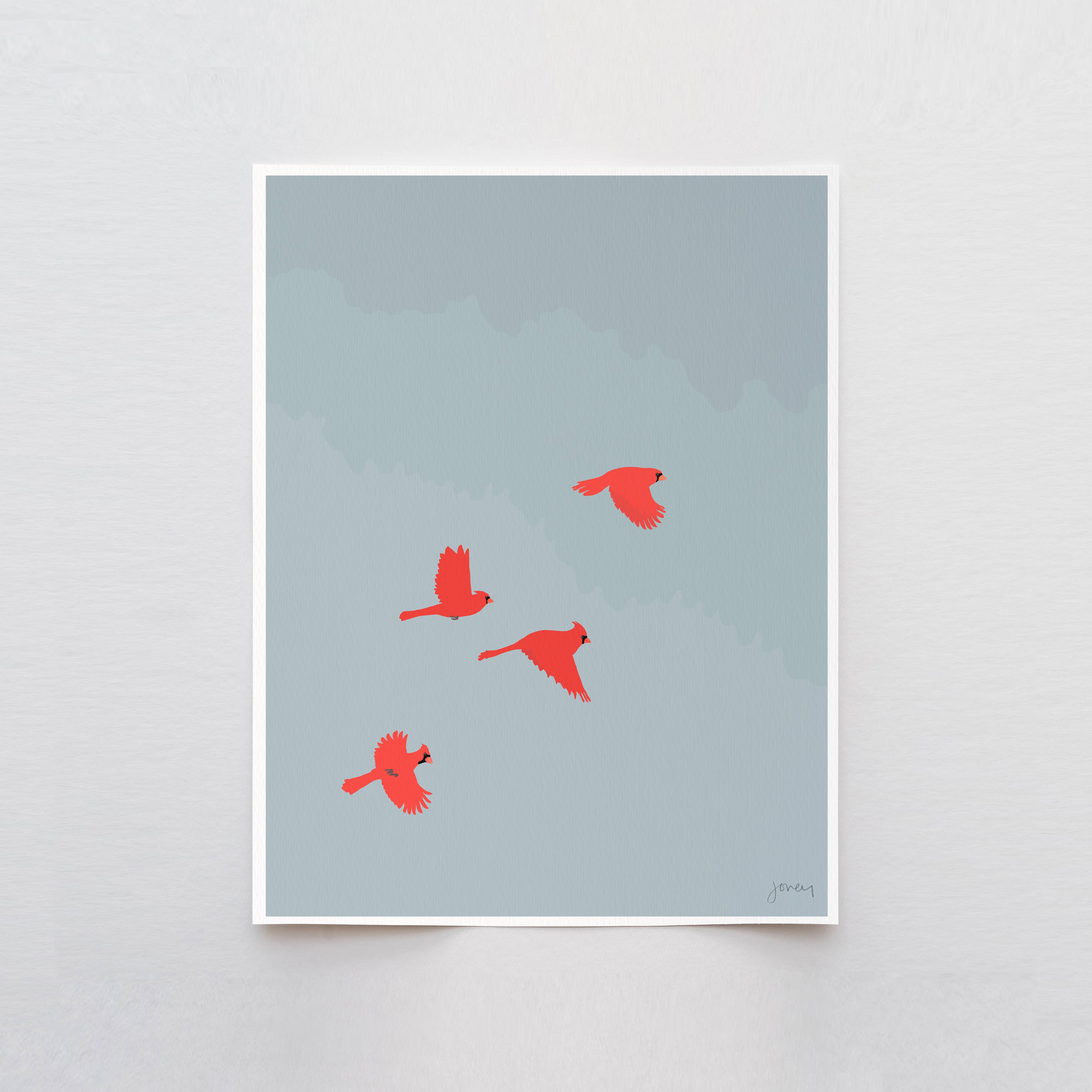 Bring the beauty of nature into your home with this Four Flying Cardinals art print, created in the artist’s New England studio. Each print is hand-signed, printed on heavyweight cold press paper with archival inks, and includes a narrow white border for easy framing in standard-sized frames. Shipped in waterproof plastic and sturdy cardboard with tracking.
