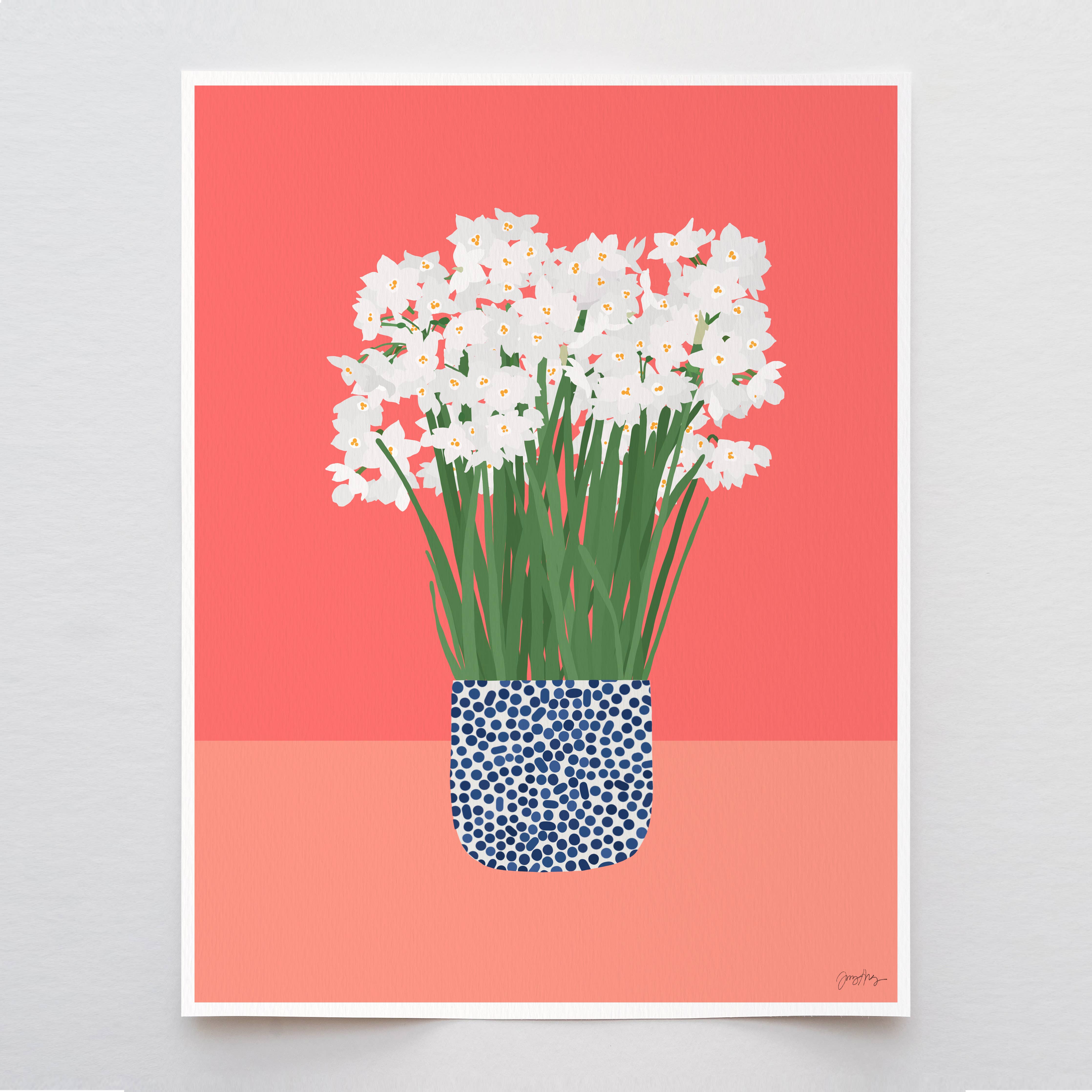 This Paperwhites Print is created on heavyweight cold-press paper with archival inks and is hand-signed in the bottom corner. A narrow white border frames the artwork. Each print is carefully packaged in waterproof sleeves and shipped in sturdy cardboard with tracking for safe delivery.