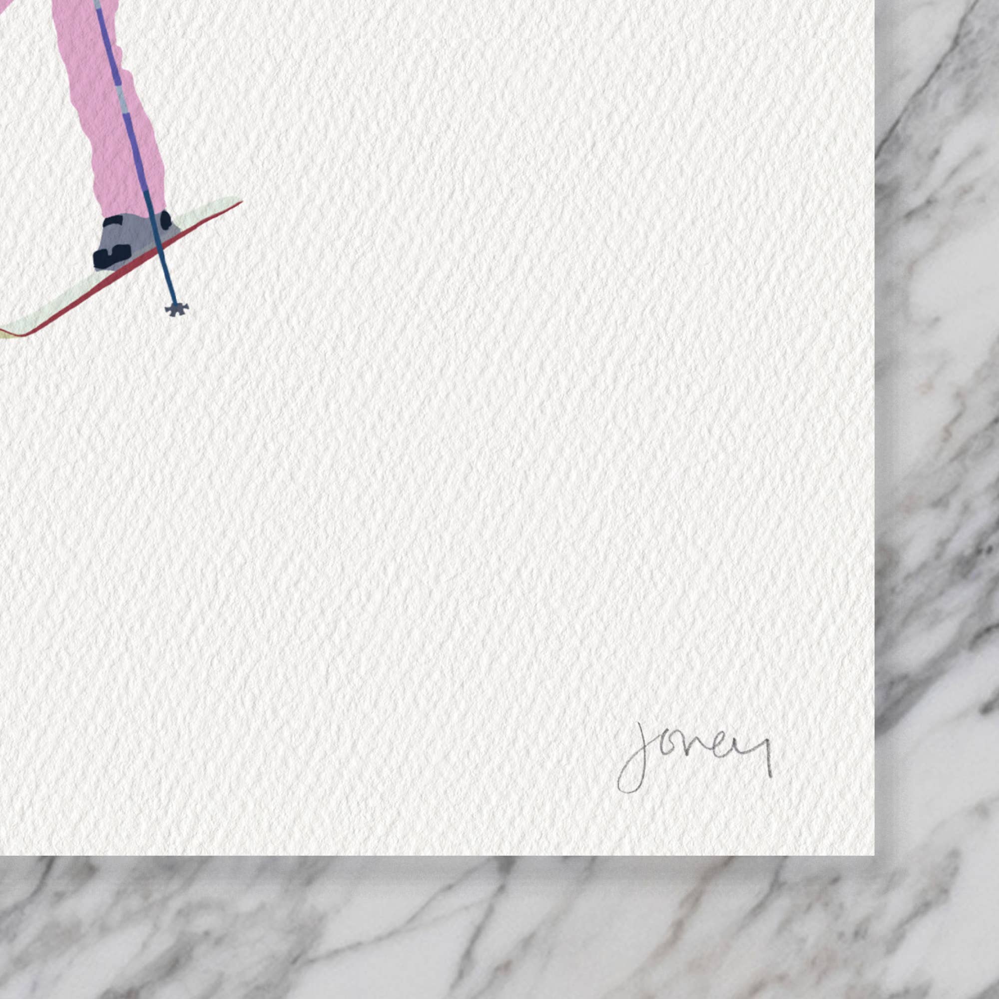 This Skiing Art Print is created on heavyweight cold-press paper with archival inks and is hand-signed in the bottom corner. A narrow white border frames the artwork. Each print is carefully packaged in waterproof sleeves and shipped in sturdy cardboard with tracking for safe delivery.