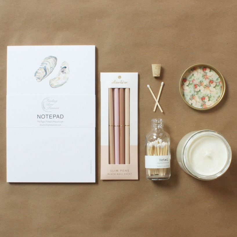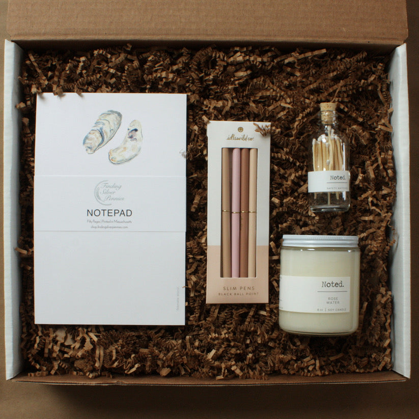 One 8oz Noted Candle, handmade from 100% soy wax. We suggest Rose Water, or Seacoast but you can choose any scent in the dropdown menu below.