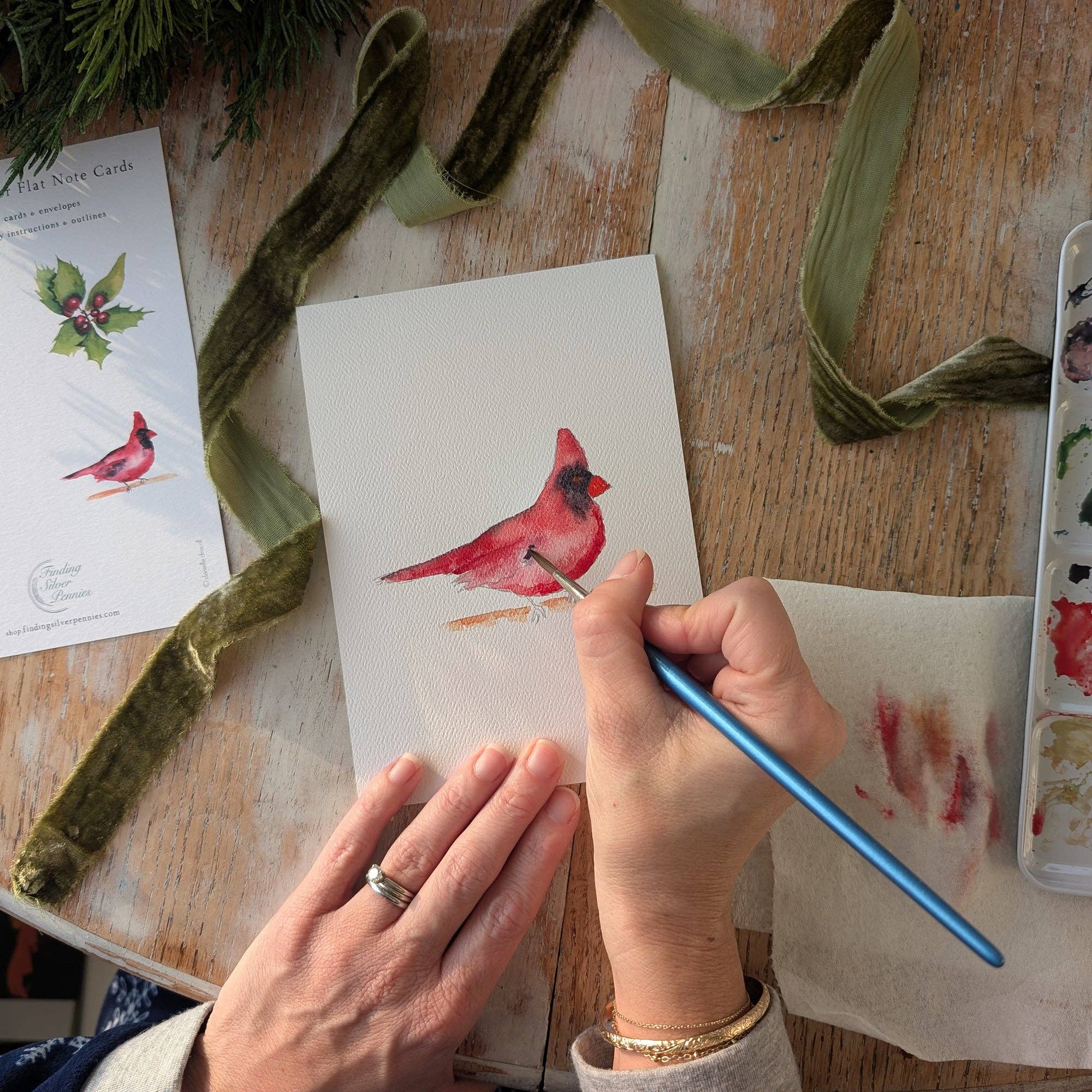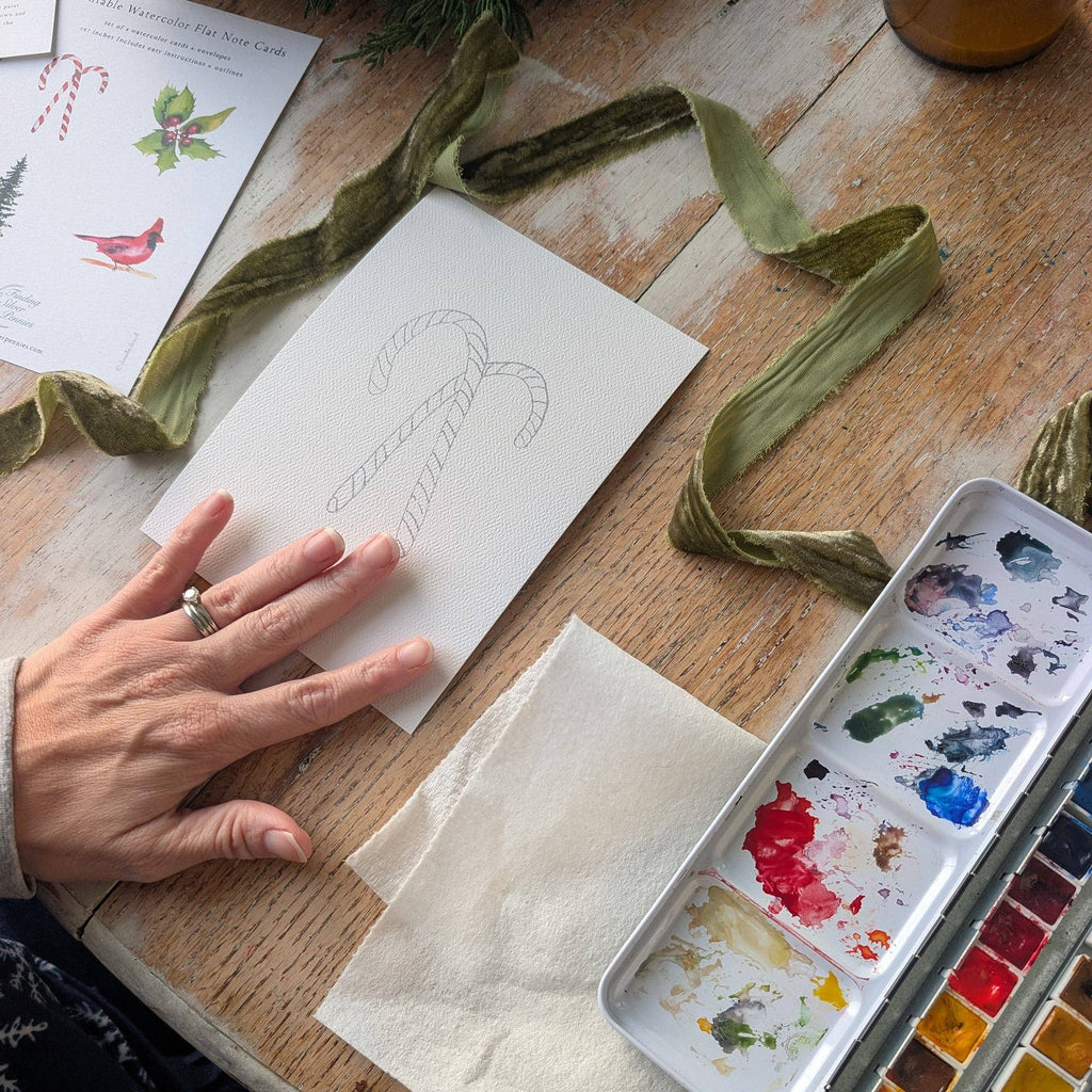 Set includes 8 flat cards, 8 envelopes, and painting instructions. Each set has 2 of each illustration: candy canes, holly, evergreen tree, and cardinal. Paint your cards and you can keep one version for yourself and send some to friends and family. Pairs well with a set or paintbrushes. Printed on 140 lb watercolor paper * set of detailed instructions * comes in clear eco-friendly gift box * Original watercolor artwork by Danielle Driscoll of Scituate MA (Finding Silver Pennies).