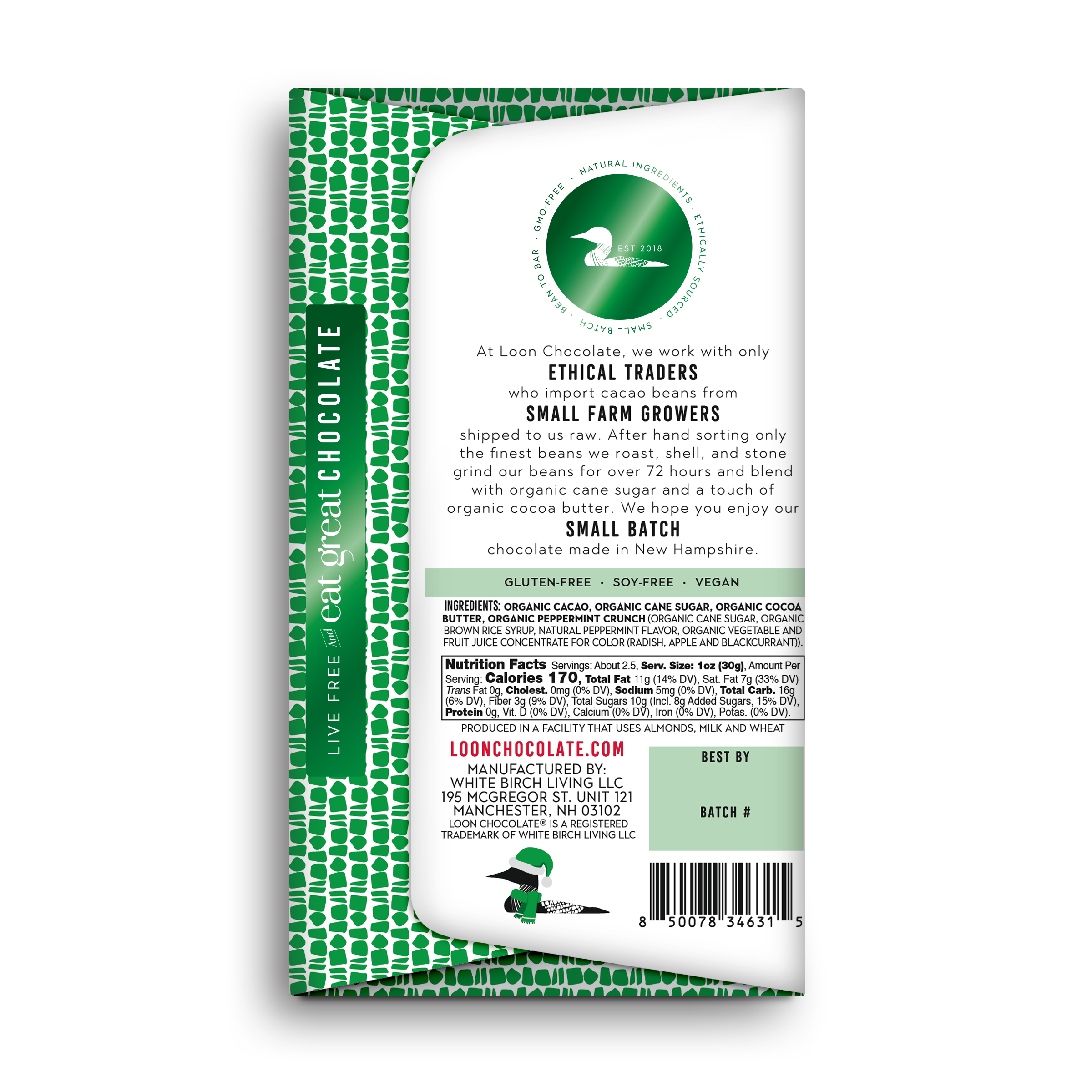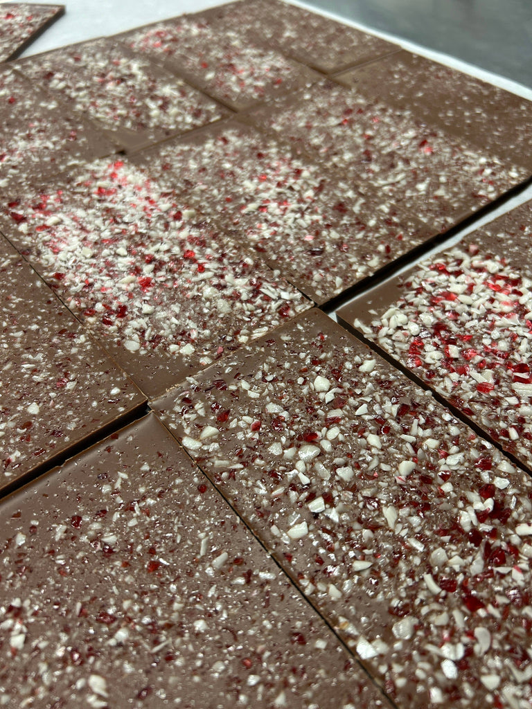 Starting with bean-to-bar 70% Dark Chocolate, each bar is topped with an all-natural & organic Peppermint Crunch to recreate a classic holiday treat! This new holiday classic has been completely re-imagined and is elevated to a whole new level. The Peppermint Crunch is all natural & organic, and the red in the crunch is colored with organic fruits & vegetables to ensure NO chemicals added (NO Red-40!!) 🌲 The chocolate bar is wrapped in colored foil on the inside - Matching the color of the bars, Green foil for Dark 🌲. Allergen friendly - the Dark Chocolate Peppermint Crunch is Soy-Free, Gluten Free, vegan.