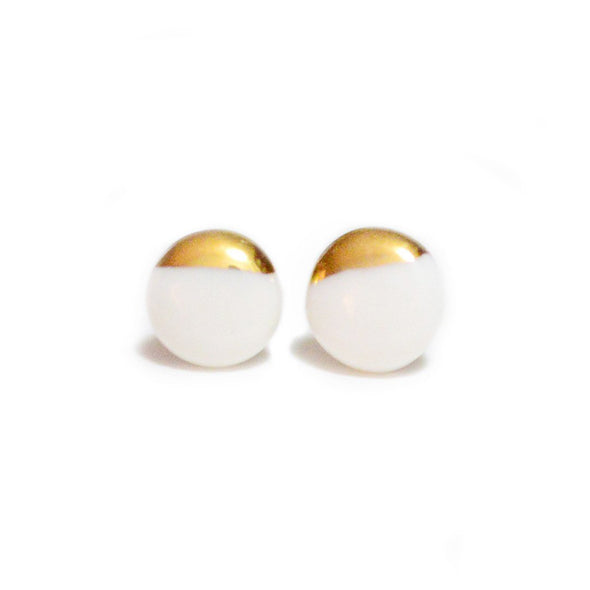 Handmade in Boston, MA by Porcelain and Stone, these 9mm rounded porcelain stud earrings are glazed in white and delicately painted with 22k gold. Set on 14k gold-filled posts, they are a classic and elegant addition to any jewelry collection.