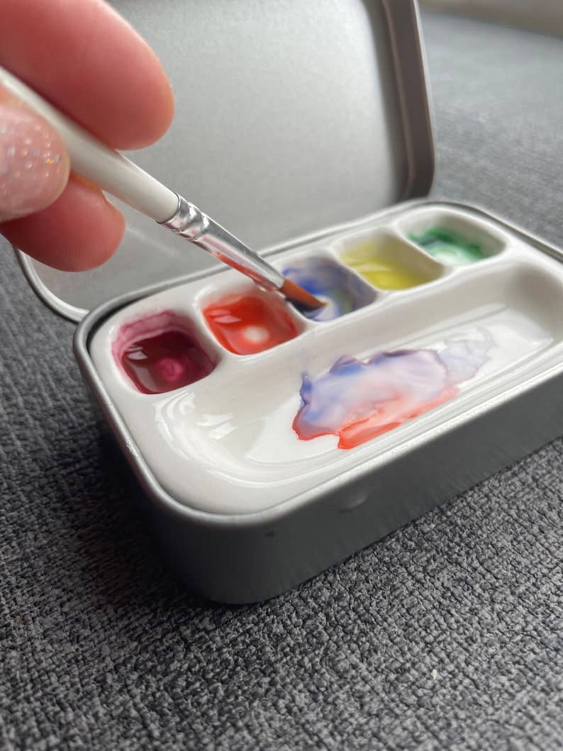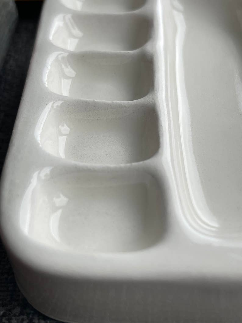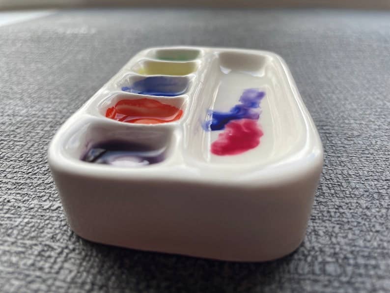 A unique handmade ceramic palette for professionals, amateurs artists or beginners. This ceramic palette fits very well into its metal container for storage or painting on the go. The palette is sturdy and durable. It was fired two times at 1020 degrees. - An elegant ceramic paint palette entirely hand-crafted. - Ideal for watercolor, gouache, and acrylic-type paints. - Eco-friendly ceramic material and non-toxic glaze. - An excellent gift for friends or craft enthusiasts. - Portable and ideal for travel. Dimensions Metal Rectangular Container: 3.75 x 2.45 x 0.8 Inch Ceramic palette approx. size: 3.54 x 2.20 x 0.74 Inch.