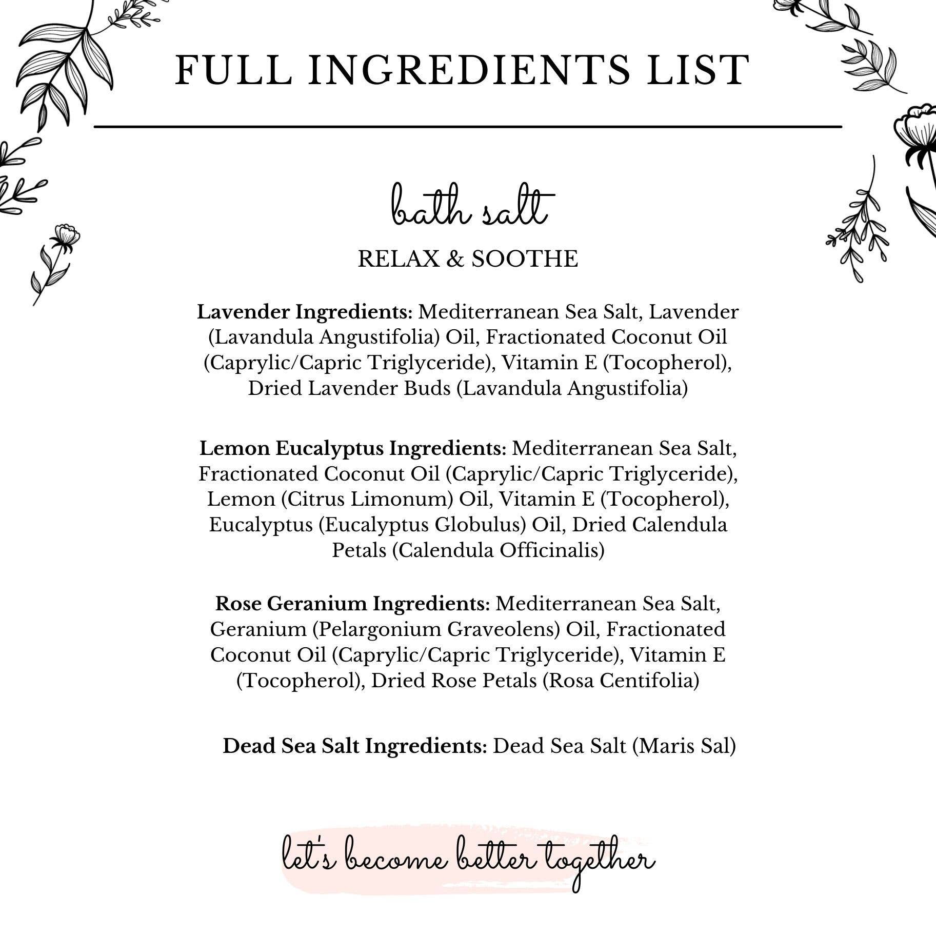 Indulge in a relaxing, mineral-rich bath experience with these soothing aromatherapy salts. Crafted from pure sea salt and infused with refreshing lemon and eucalyptus essential oil, they help moisturize dry skin while filling your bath with a fresh, floral scent. Perfect for a moment of self-care and relaxation.