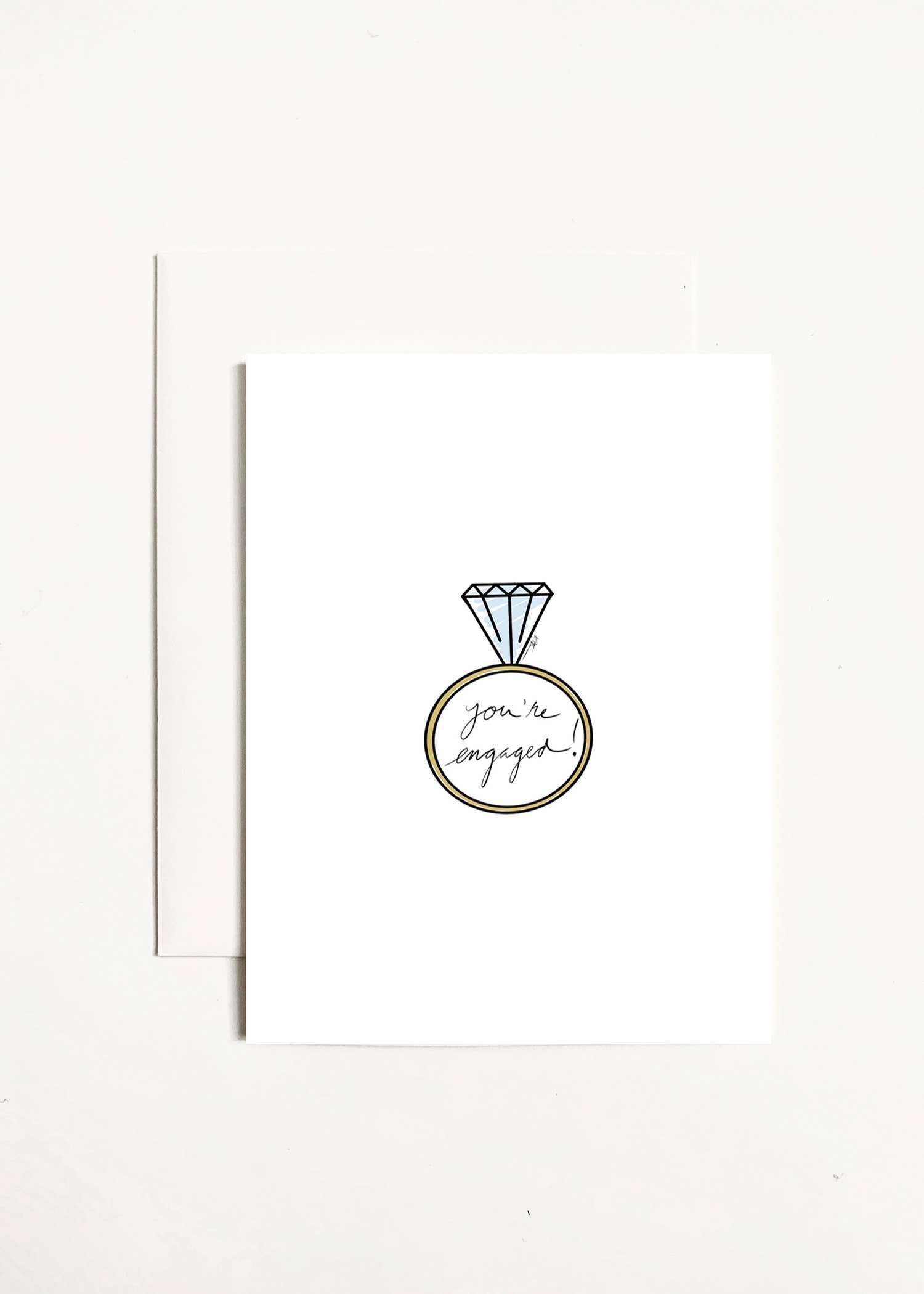 Single Engagement Greeting Card with a blank inside area for your own personal message. Cards are 4.25" x 5.5" and individually packaged with a white envelope in clear plastic sleeve. Designed in MA by a woman owned small business, printed in the USA.